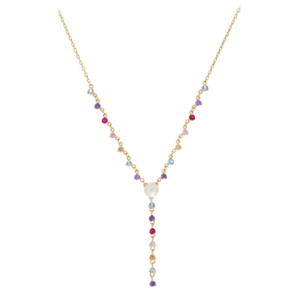 Realizzata in argento dorato, presenta una sequenza armoniosa di gemme multicolore con riflessi delicati. Al centro spicca una perla bianca dal carattere raffinato, da cui scende un filo verticale di piccole gemme che crea un elegante effetto a Y.