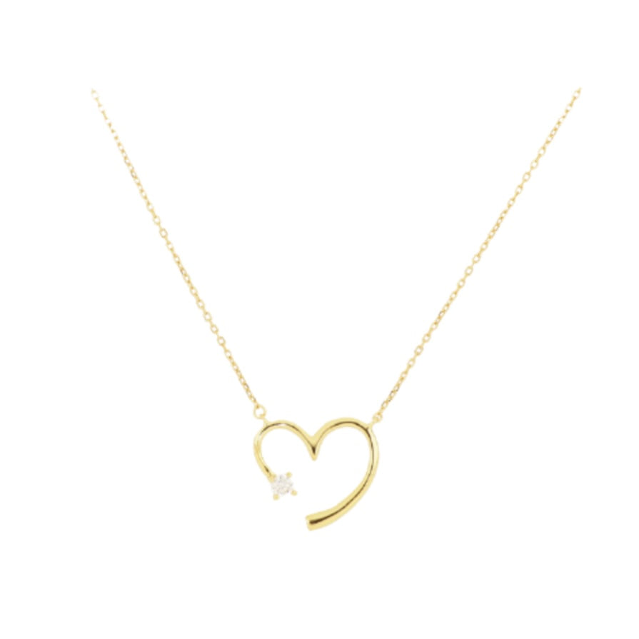 Realizzata in argento dorato, presenta una catena fine che valorizza un pendente a cuore aperto dalla linea morbida e asimmetrica. Sul lato inferiore del cuore brilla un zircone luminoso, dettaglio che aggiunge un tocco di luce raffinata e discreta