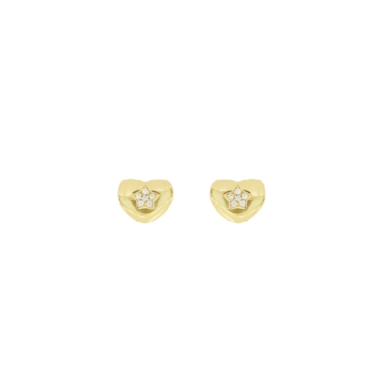 Realizzati in argento dorato, presentano una forma a cuore pieno dal profilo morbido e raffinato. Al centro del cuore spicca una stella impreziosita da piccoli zirconi che aggiungono brillantezza e un tocco di magia.