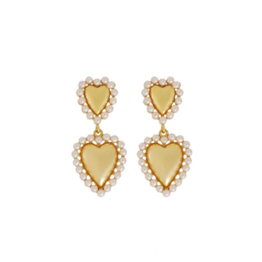 Realizzati in argento dorato, presentano due cuori pendenti disposti in verticale, creando un movimento armonioso e delicato. Ogni cuore è incorniciato da un profilo di perle bianche, dettaglio che dona luce e un’eleganza classica al design.