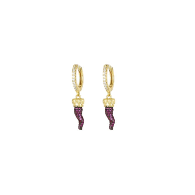 Realizzati in lega dorata, presentano una base a cerchio impreziosita da piccoli zirconi bianchi che aggiungono brillantezza al lobo. Da ogni cerchio pende un charm a peperoncino, ricoperto da zirconi viola che creano un effetto ricco e vibrante. La parte superiore del pendente è rifinita con un dettaglio dorato che richiama una piccola corona, aggiungendo un tocco di eleganza distintiva.
