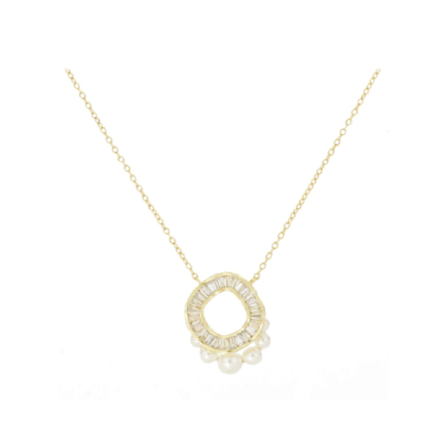 A completare il pendente, una delicata cascata di perle bianche che aggiunge un tocco di femminilità senza tempo. La catena sottile e dorata esalta la brillantezza del pendente, rendendo il gioiello perfetto per look eleganti, cerimonie o per dare un accento prezioso all’outfit quotidiano.