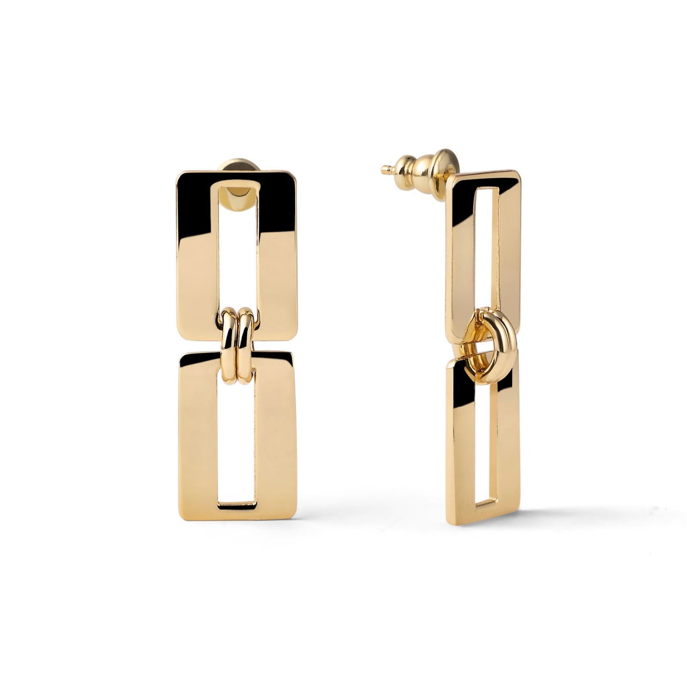 Orecchini pendenti con due maglie piatte di catena rettangolare dorata e chiusura a farfallina. Design geometrico ed accattivante per questi orecchini dalla linea grintosa ed inconfondibile ispirato alle stampe optical anni '80. Un gioiello in catena che da solo costruisce un look e cattura ogni sguardo.